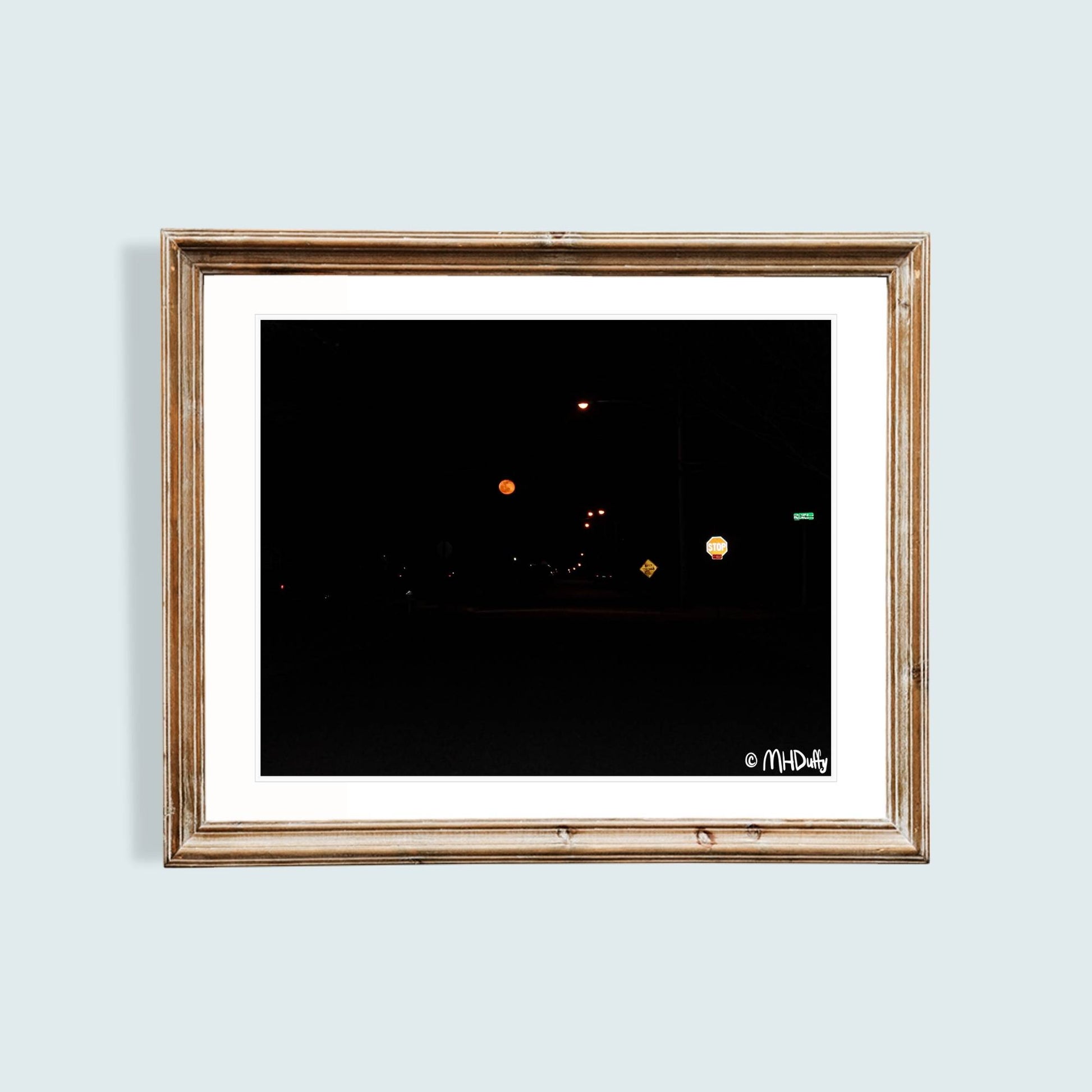 On a side street in Pennsylvania, USA. Dark night, red moon, street signs, and lights. Taken April 5th 2015, the day after the lunar eclipse.